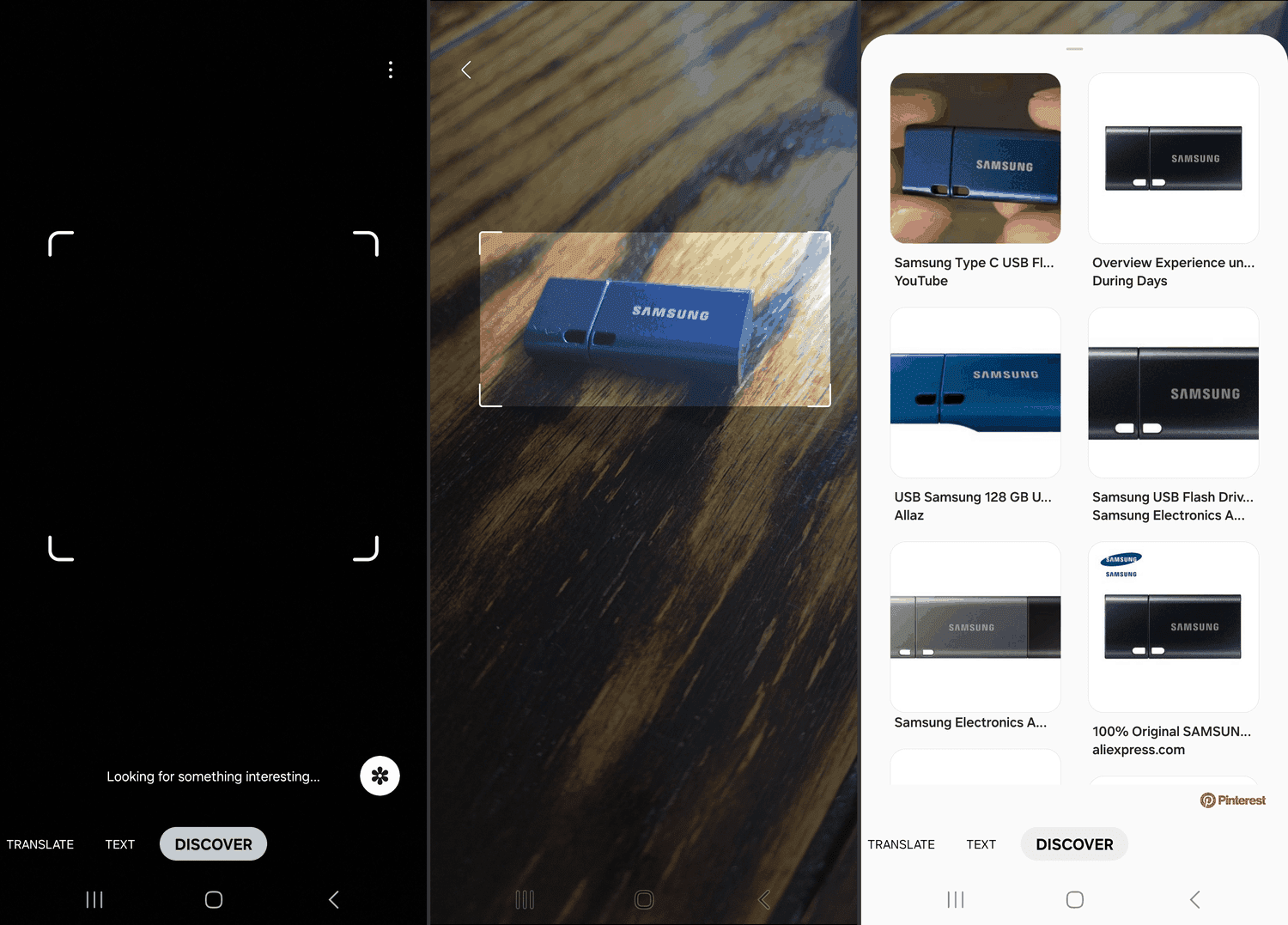 Select Discover at the bottom of the Camera app, and then point the camera at any object. Bixby Vision displays similar images it finds online. This is particularly useful if you're not sure how to describe something that you want more information about.