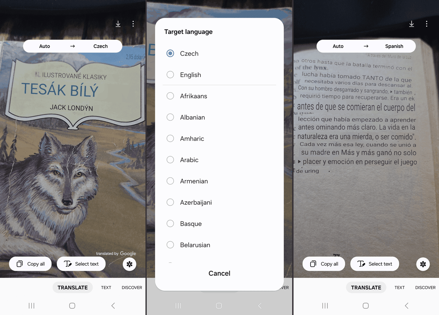 While Text mode can translate text, as shown above, Bixby Vision also has a dedicated Translate mode. Translating text this way is a little faster, and you can choose from a long list of target languages.