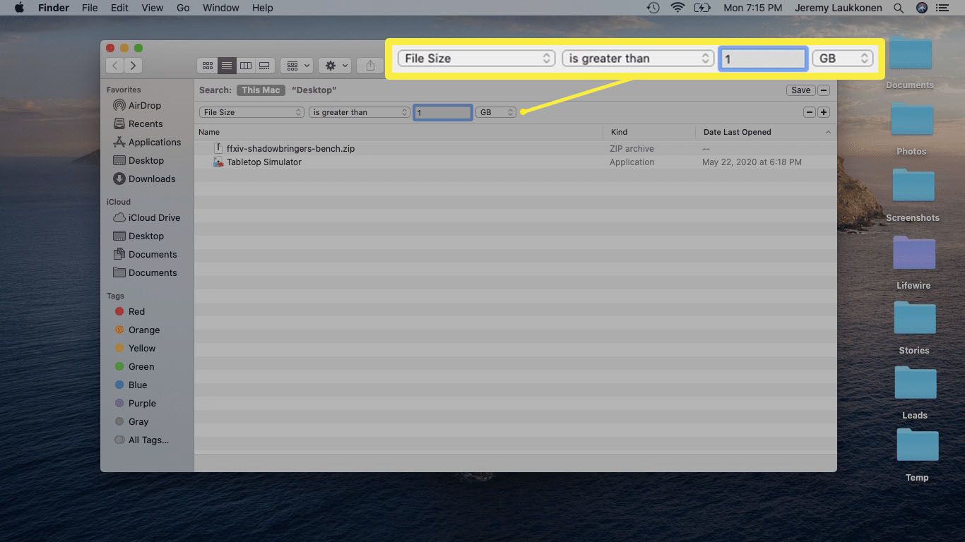 You can also search for files that are larger than a specified size to identify candidates for deletion. Do this by changing the first menu to File Size, and the second one to is greater than.