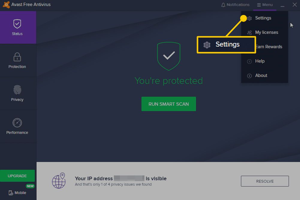 Open Avast and select Menu at the top.