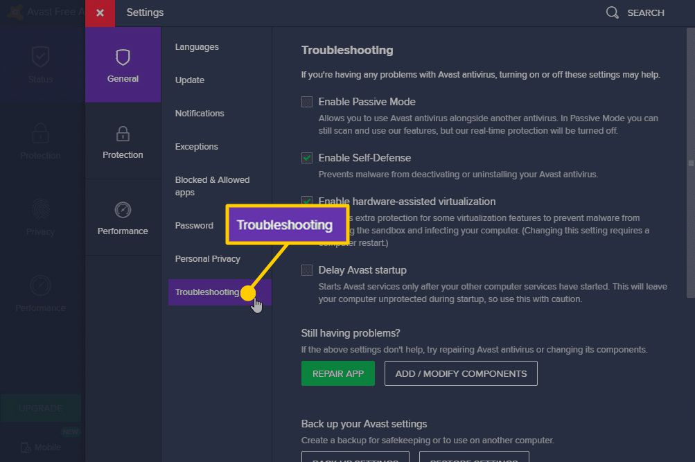 To disable self-defense mode in Avast, you'll need to go into a 'hidden' area of the Settings.